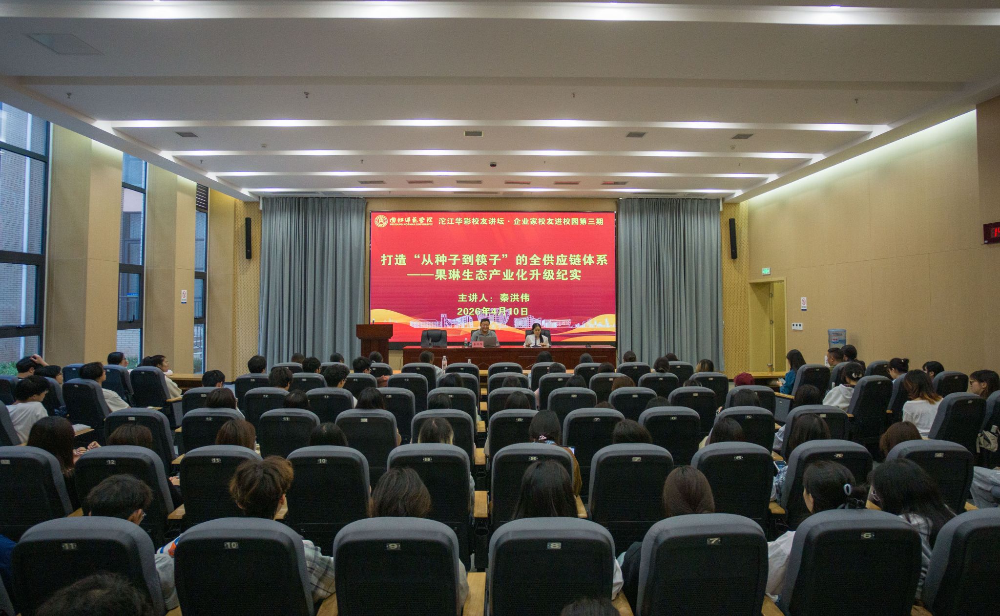 2026年4月10日下午,我校经济管理专业1997级校友、果琳生态创始人秦洪伟重返母校,在会议中心小报告厅为水产学院师生作题为《从种子到筷子——农业全产业链的实践与思考》的专题讲座。重庆校友分会秘书长姜国俊出席活动。讲座由合作交流处副处长谢丽春主持。